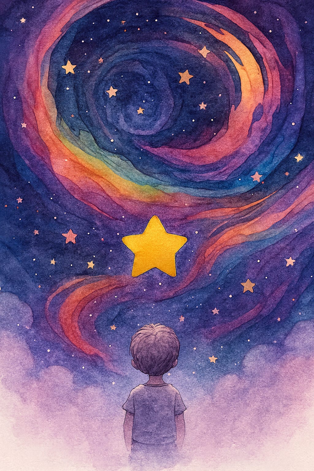 A child gazes into a swirling sky of stars and color — a visual echo of wonder, memory, and the melody that inspired Mozart’s “Ah! vous dirai-je, Maman.” Image created by Afterforever (Canva).